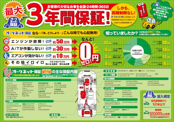 当店では、最大3年まで保証をお付けすることができます。 最大140項目の機関をガッチリ保証いたします。 保証機関 料金表